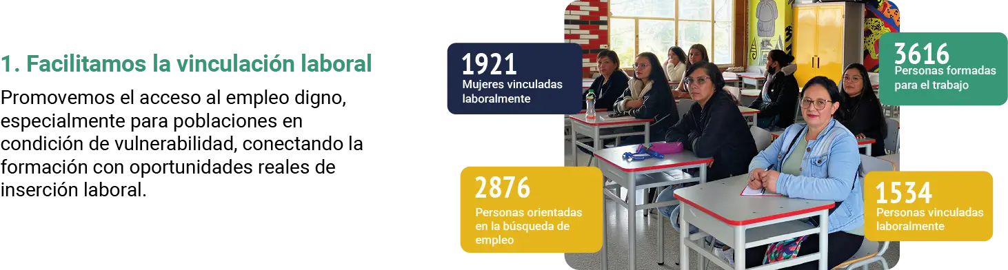 En 2025, desde la Corporación Industrial Minuto de Dios consolidamos nuestro compromiso con el desarrollo integral sostenible en Colombia, acompañando a poblaciones vulnerables, fortaleciendo emprendimientos y mejorando la productividad empresarial. Este balance refleja historias de transformación real: personas que acceden a empleo digno, familias que fortalecen sus ingresos y territorios que avanzan hacia un futuro más equitativo y resiliente.